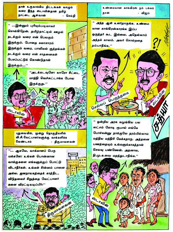 டியர் மிஸ்டர் வாசகரே !தி.மு.க. அரசு தொடரத் தகுதியானதா?"எங்கே பார்த்தாலும் பாலியல் கொடுமை...!" பிரேமலதா பேச்சு - அதிர்ந்த முதல்வர் !வாக்காளர்களுக்குப் பணம் - தேர்தல் முடிவை மாற்றுமா?"விஜய்க்கு கூடும் கூட்டம் அத்தனையும் ஓட்டாகாது" - பியூஷ் கோயல் பேட்டிவேகமெடுத்த பா.ஜ.க. பிரச்சாரம் !சென்னையில் நடத்தப்படும் கருத்து கணிப்புகள் பலிக்குமா?ஜன்னல் வழியேவிஜய்யின் வாக்குறுதிகள்தேர்தல் வாக்குறுதியில் மதுவிலக்கை கைவிட்ட தி.மு.க.இது விசில் புரட்சித் தேர்தலா?டெல்லி டைரிலஞ்ச மேவ ஜெயதே !பொய்யிலே பிறந்து பொய்யிலே வளர்ந்த தி.மு.க.மஹாபாரதம் பேசுகிறது - சோடியர் மிஸ்டர் துக்ளக்கார்டூன் சத்யாகார்டூன் ராஜுகார்டூன் அட்டை