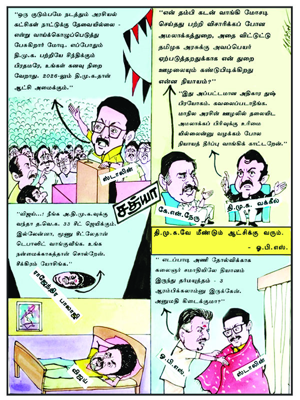 விநாசகாலே விபரீத புத்தி'அ.தி.மு.க. வாக்குவங்கி த.வெ.க. பக்கம் ....!' - நாஞ்சில் சம்பத் சொல்கிறார்திருப்பரங்குன்றமும் தி.மு.க. அரசும் !"எஸ்.ஐ.ஆர். விஷயத்தில் தேர்தல் ஆணையம் வெளிப்படையாக நடந்து கொண்டால், நாங்கள் எதிர்க்க மாட்டோம்" - தி.மு.க. எம்.பி.தமிழச்சி தங்கபாண்டியன்தூணை விழுங்கிய திமிங்கிலம்தி.மு.க. - 75, இன்னொரு கிழக்கிந்தியக் கம்பெனி - 440 தொகுதிகள் கேட்கும் காங்கிரஸ் !எங்கு தீபம் ஏற்ற வேண்டும்? - திருப்பரங்குன்றம் சர்ச்சை !நினைத்துப் பார்க்கிறேன்ஜன்னல் வழியேஇரண்டு தீர்ப்புகள்கும்பகோணத்தில் நடந்த பா.ஜ.க. நிர்வாகிகள் மாநாடு !தி.மு.க. அரசின் நான்காண்டு சாதனை - ஒரு பார்வை - 27டெல்லி டைரிமஹாபாரதம் பேசுகிறது - சோடியர் மிஸ்டர் துக்ளக்கார்டூன் சத்யாகார்டூன் ராஜுகார்டூன் அட்டை